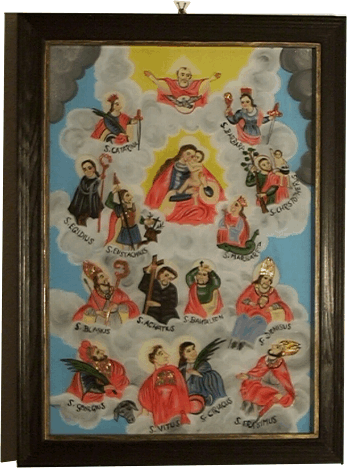 Titel: Die 14 Nothelfer Größe: Breite: 31,5 cm, Höhe: 43 cm Mit diesen "Hauspatronen" sind 14 Heilige als Nothelfer zusammengefaßt und man hat hiermit einen "Rundumschutz". Die Vorlage stammt wohl aus dem Bayerischen Wald